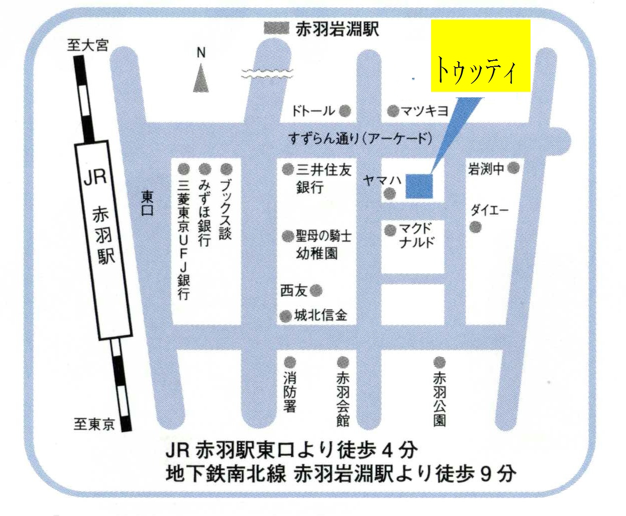 トゥッティ学習教室は、生徒たちが通いやすい赤羽駅の近くにあります。
